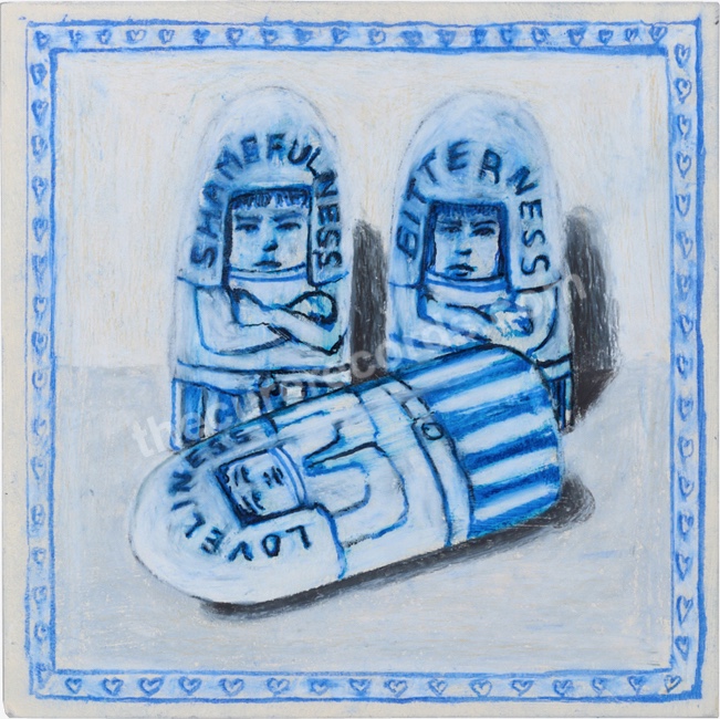 One-sided. Blue vinyl. Number 014. Artist: Jonathan R. Bennett. Medium: Wax pastels and ink.
