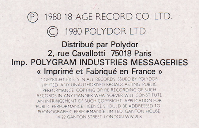 Promo stamp on top-left corner of front sleeve. "POL 365" and "Imp. PolyGram Industries Messageries" on back sleeve. Promo Polydor inner sleeve. Black inner ring. Square box on label reads "Fabriqué en France".