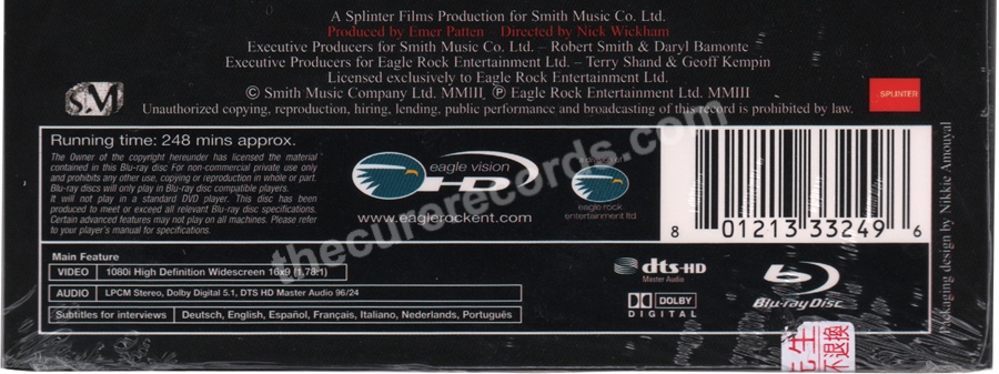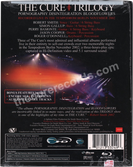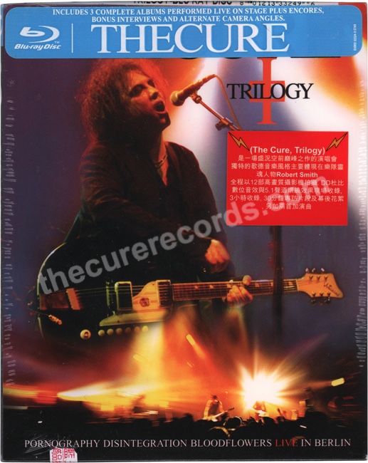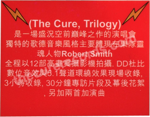US edition with Taiwanese sticker. Text says "(The Cure, Trilogy) A spectacular live concert showcasing the band's unique gothic style, embodied mainly by its creative soul: Robert Smith. The entire show was filmed with 12 high-definition cameras and recorded in Dolby Digital with 5.1 surround sound. Includes 3 hours of footage, 30 minutes of exclusive interviews and behind-the-scenes material, plus two additional live performances."
